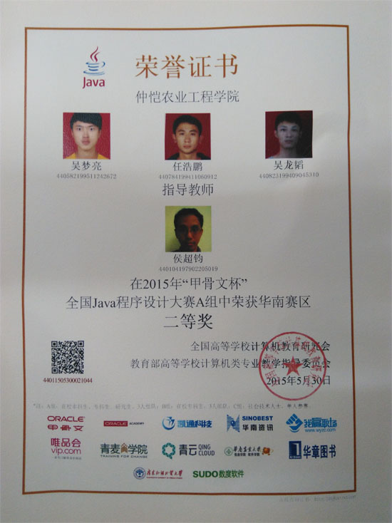 “2015全国Java程序设计大赛”的获奖名单近日揭晓,计算科学学院共派出通过初赛的5支队伍共15名学生参赛,其中获得华南赛区二等奖1项(信计133任浩鹏、吴龙韬、吴梦亮),此次比赛重在锻炼学生备赛队伍,以赛促学,以赛代练,促进学生参加后续全国蓝桥杯软件比赛与ACM程序设计竞赛做好积极的准备工作。