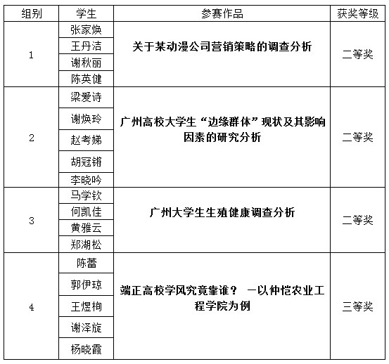 第五届全国大学生市场调查与分析大赛华南区选拔赛5月16号在暨南大学落下帷幕,计算科学学院派出18名学生参赛,其他参赛队伍有来自暨南大学、华南农业大学、汕头大学等9所高校的学生。在孙红英、杨姣、郑伟三位老师的悉心指导下,共获得二等奖3项(分列华南区排名第7,8,9名)、三等奖1项的佳绩,其中获得二等奖的两个团队晋级本月底在北京举行的大陆总决赛。