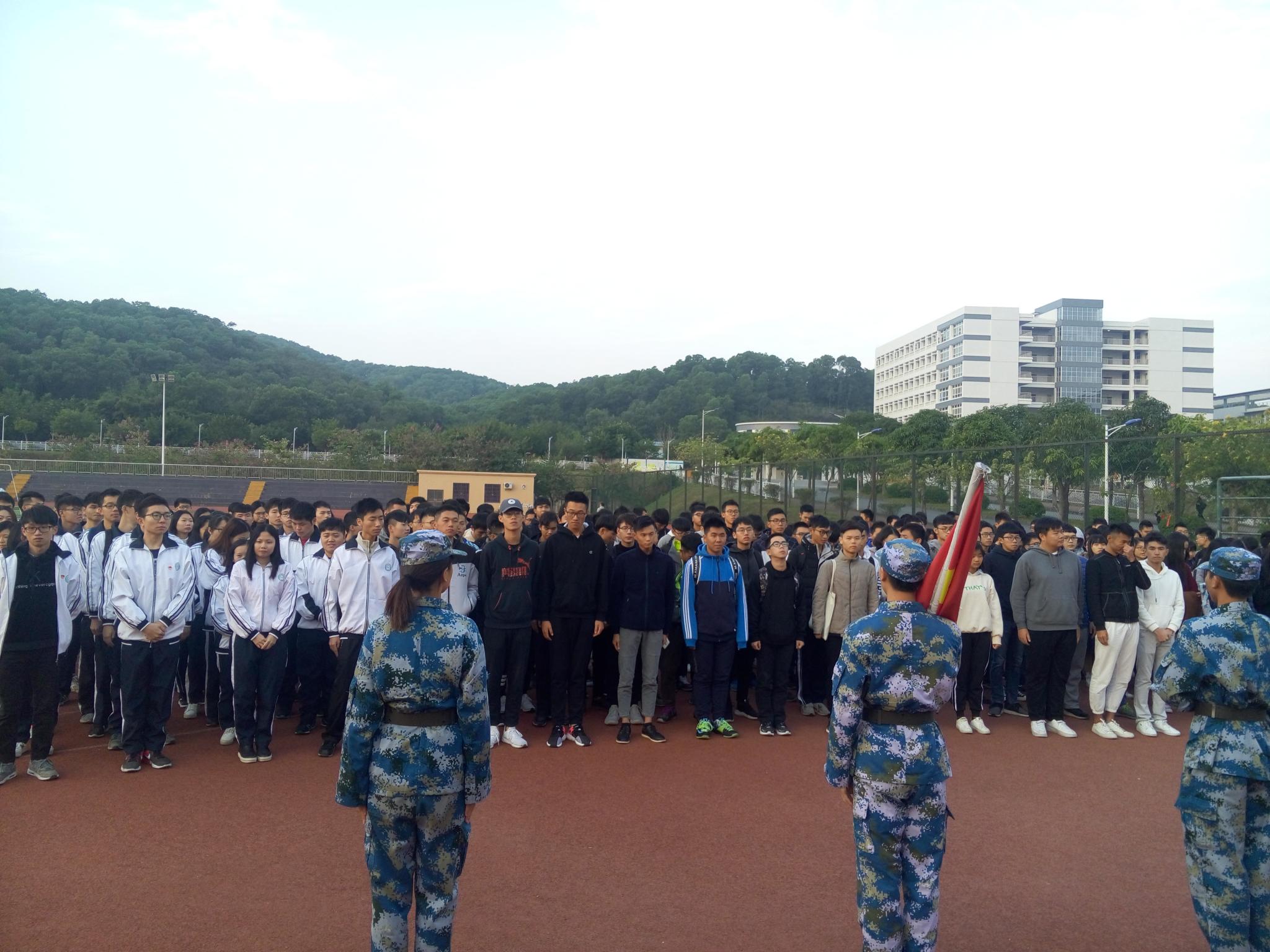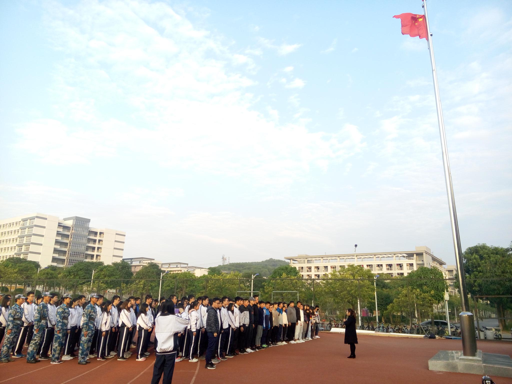 2017年12月8日上午7:30,计算科学学院在白云校区足球场举行“铭记‘一二九’ 传承爱国志 践行新使命”升国旗仪式。本次升国旗仪式由计算科学学院学生党支部组织举办,辅导员徐盼主持,党支部副书记郭肖明、学生党支部全体成员、辅导员助理,以及17级全体学生参加。