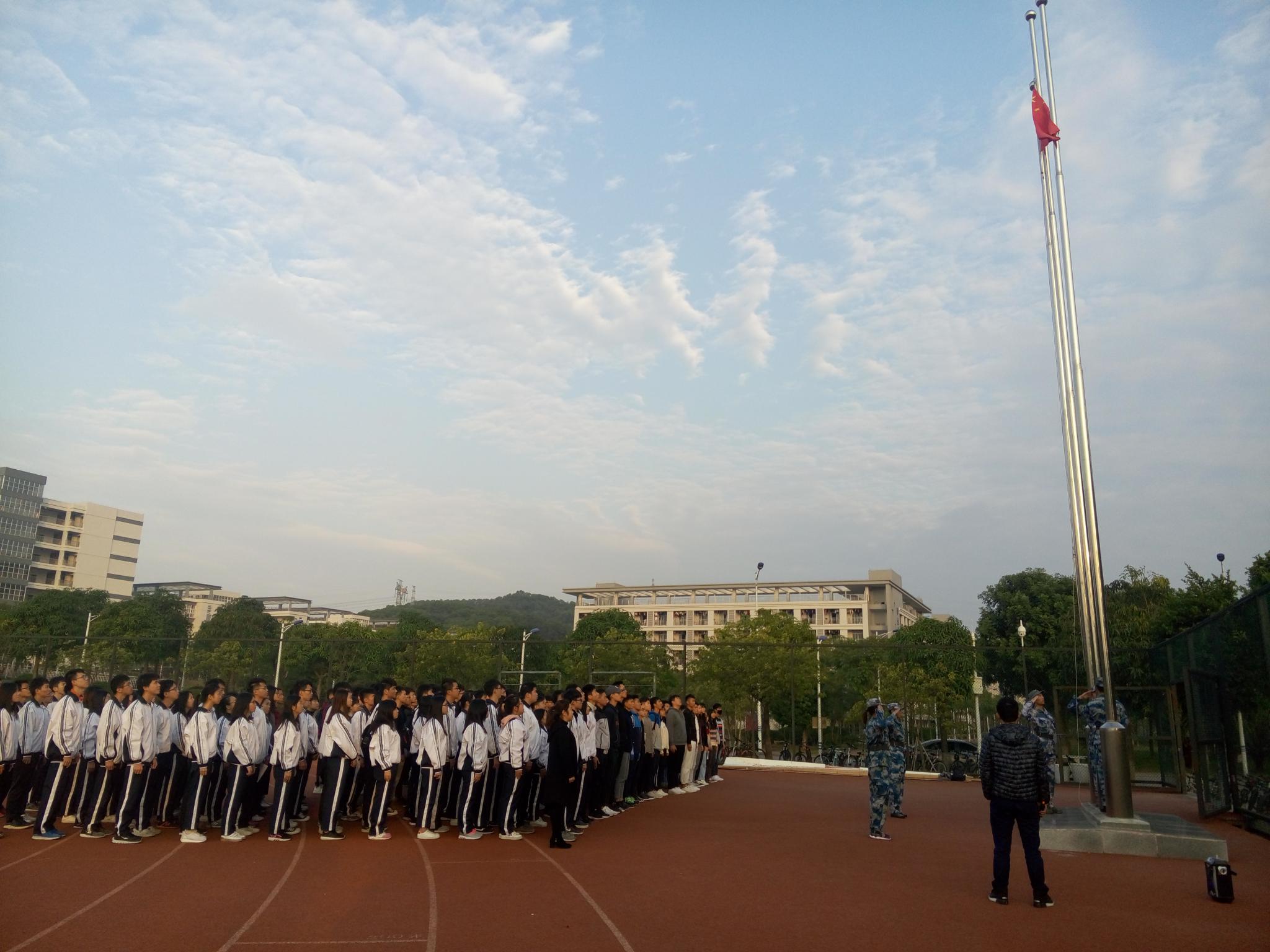 在场人员排列整齐后,徐盼老师宣布升旗仪式正式开始。我院学生教官团兼任本次升旗仪式的护旗手和升旗手,他们穿着教官服代表我院升旗。参加升旗的全体人员严肃以待,跟着伴奏唱起国歌,目光始终追随冉冉升起的国旗。