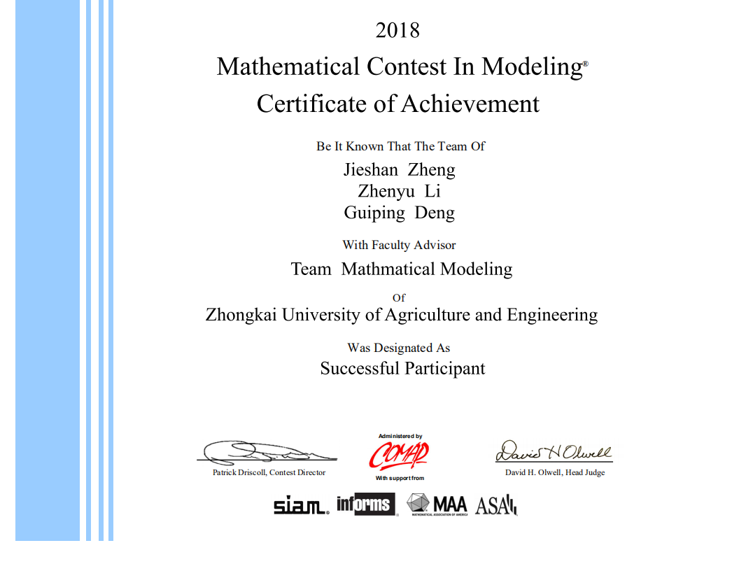 美国(国际)大学生数学建模竞赛(MCM/ICM)由美国数学及应用联合会(COMAP)主办,是世界顶级的数学建模竞赛,享有数学建模“奥林匹克”之称。该项赛事始于1985年,现已成为世界上影响范围最大的大学生学科竞赛之一,大赛每年都吸引来自哈佛大学、麻省理工学院、北京大学等全球各大高校的优秀学生参与角逐。竞赛旨在考查参赛者综合运用数学知识解决实际问题的能力和创新能力,竞争激烈。我校参加学子们在比赛中奋力拼搏,取得佳绩,充分体现了我校学生运用数学和专业知识解决实际问题的实践能力和创新水平。