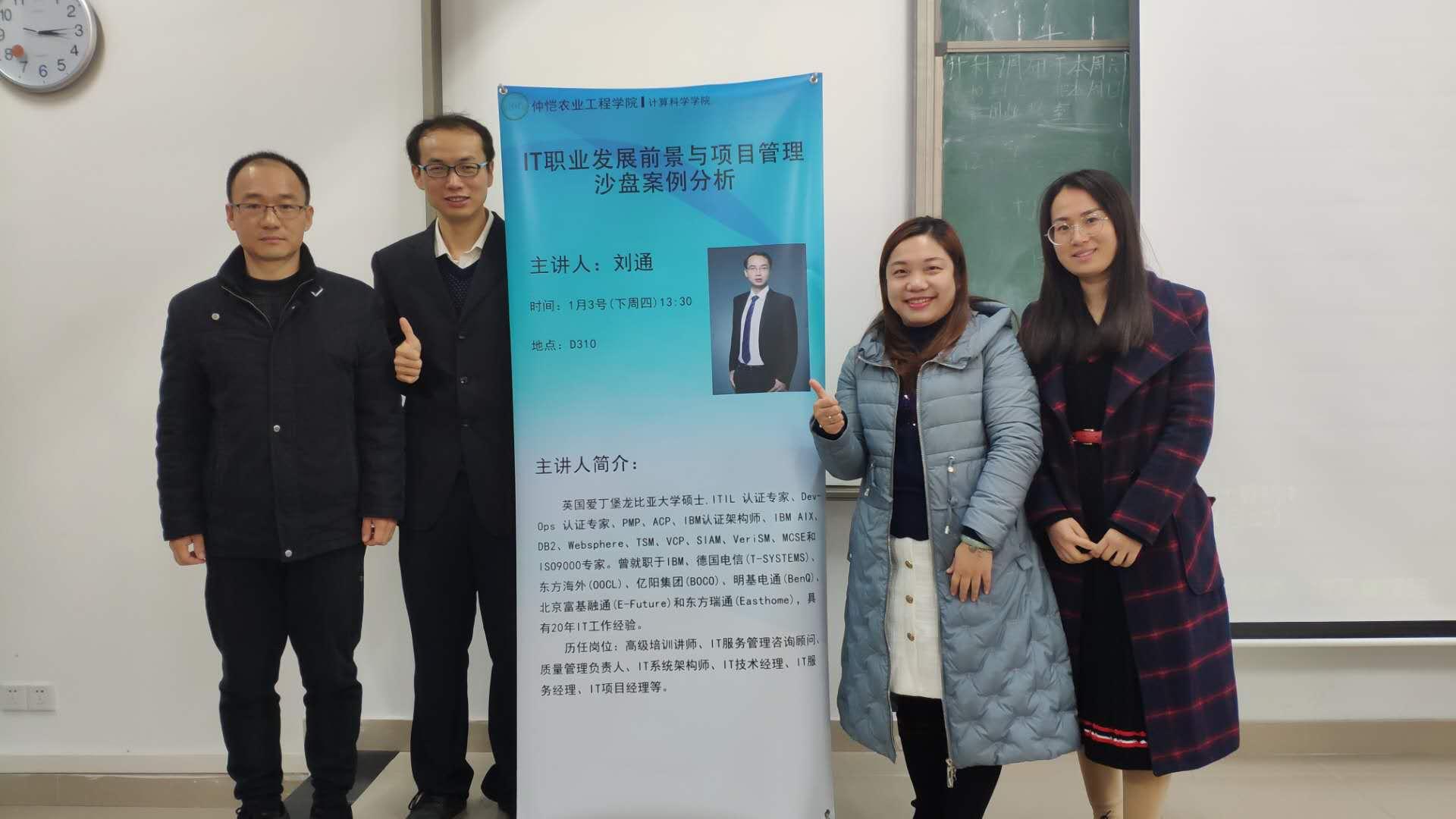 2019年1月3日,计算科学学院在白云校区D栋310多媒体课室举办了题为“IT职业发展前景与项目管理沙盘案例分析”的讲座。本次讲座,我院有幸邀请到东方瑞通培训讲师刘通老师为我院学生开讲,参与本次讲座的有计算科学学院党总支副书记郭肖明、辅导员张素雅,讲座由信息与计算科学系主任王前老师主持。