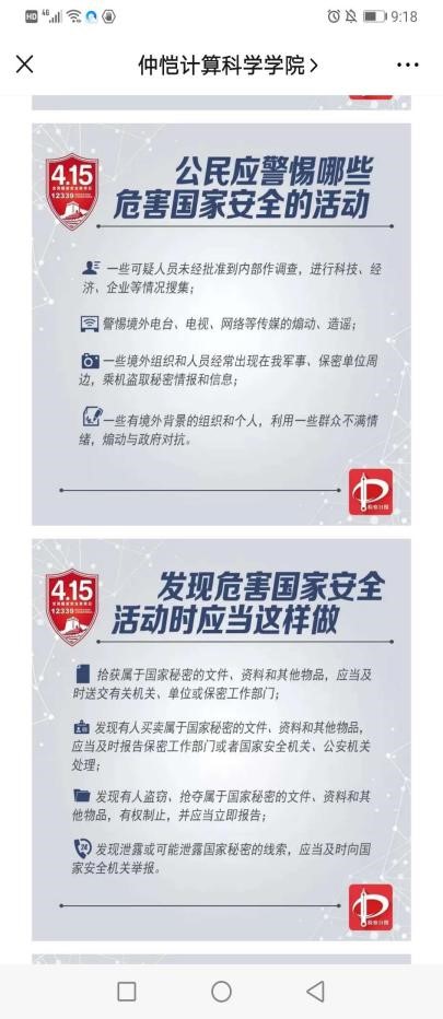 2020年4月15日是我国第五个“全民国家安全教育日”。为贯彻落实习近平总书记重要指示精神,做好我校国家安全教育工作,进一步增强学生维护国家安全的意识和能力,4月15日,计算科学学院组织全体师生观看“国家安全”教育短片,传播国家安全知识,提高我院师生的安全责任意识。