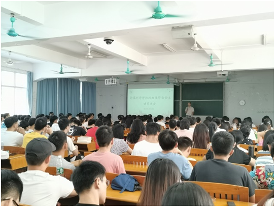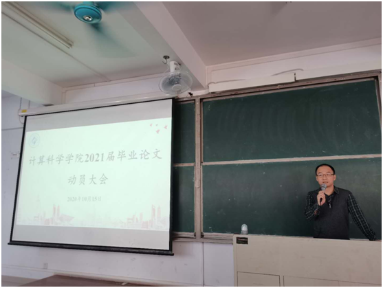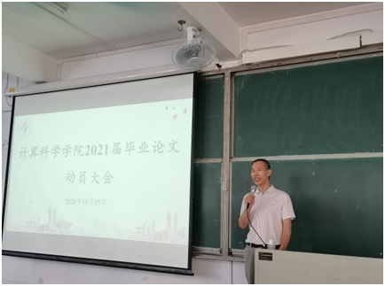 10月15日下午,计算科学学院在杨楼310室召开2021届毕业论文动员大会,出席本次会议的有学院党总支书记刘伟坚、副院长吴东庆、党总支副书记郭肖明、信息与计算科学专业系主任王前、统计学专业系主任杨志伟,各毕业论文指导老师、辅导员张素雅以及2021届全体学生。本次会议由王前主持。