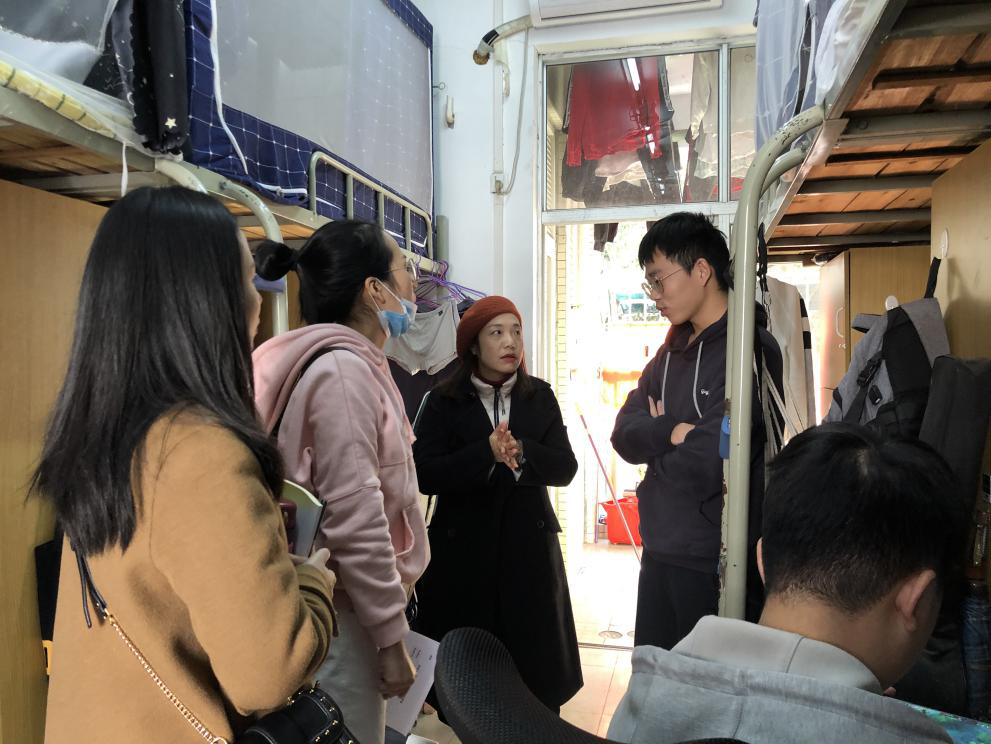 郭肖明与学生亲切交谈,对内务整洁的宿舍给予肯定,并了解学生近期的学习和生活,提醒学生注意返程安全,在离校回家前整理好宿舍内务,处理好宿舍垃圾,预防四害;注意断水断电,以避免安全事故的发生。