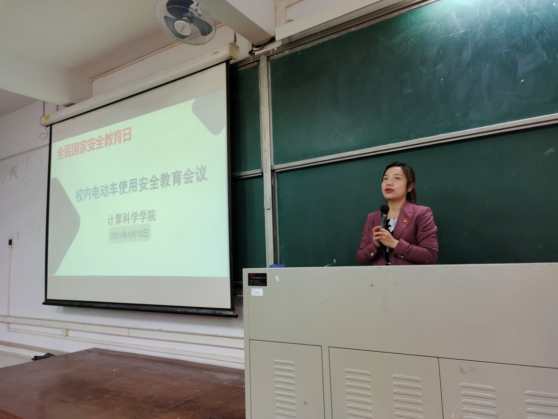 4月15日下午,为契合全民国家安全教育日,计算科学学院在杨楼103召开了我院校内电动车使用安全教育会议,参与本次会议的有党总支副书记郭肖明,辅导员张素雅、廖蕃、吕依驰,以及我院使用电动车的全部学生。