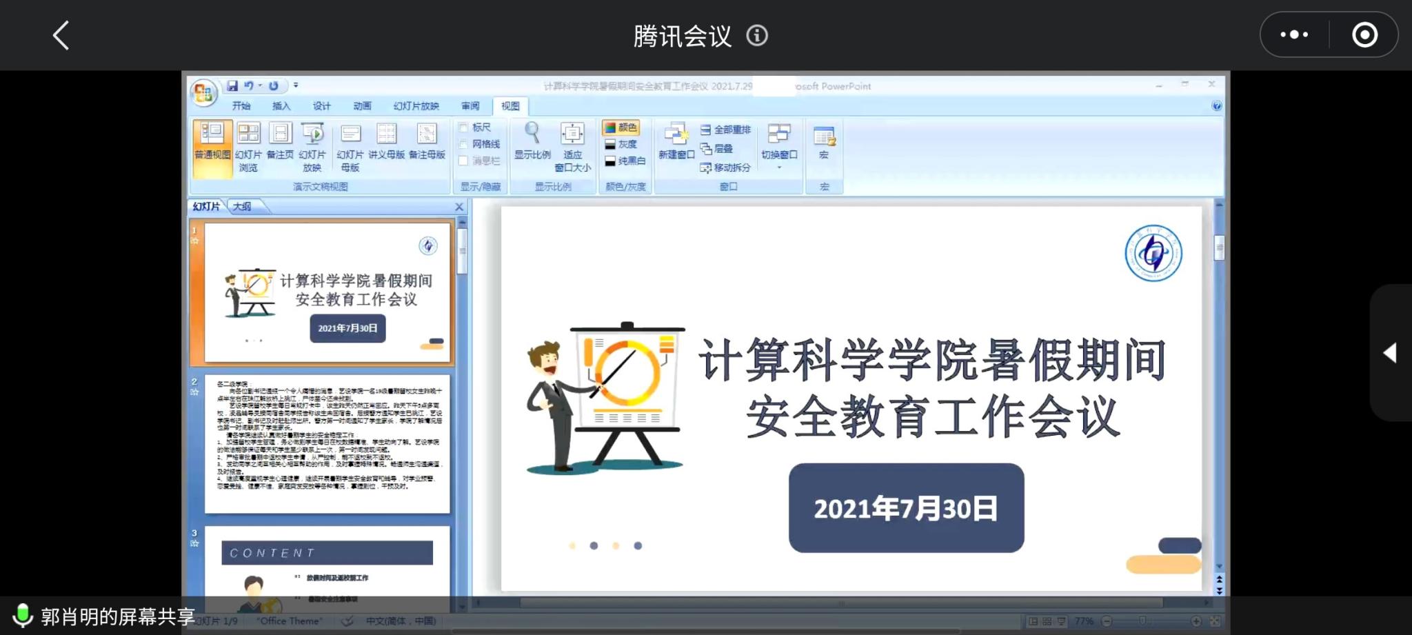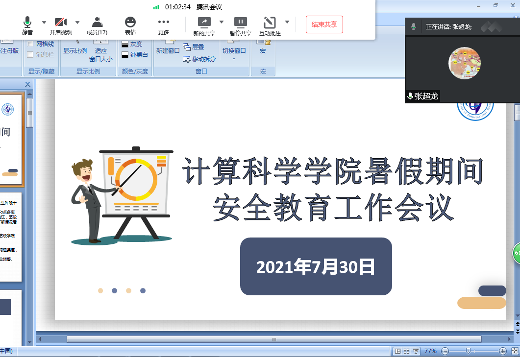 7月30日,计算科学学院在线上召开安全教育工作会议。参与本次会议的主要有计算科学学院党委书记刘伟坚、院长张超龙、党委副书记郭肖明、全体班主任以及辅导员。本次会议由郭肖明主持。