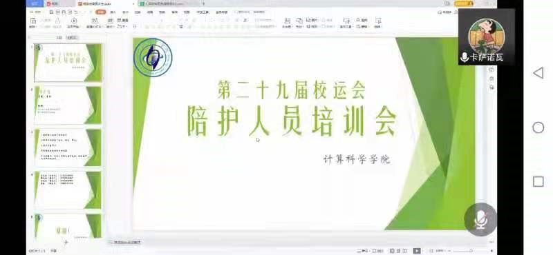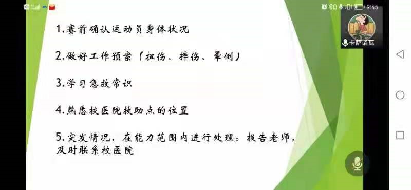 解廷鑫进一步详细解说了陪护人员注意事项:需赛前确认运动员的身体状况;做好工作准备(扭伤、摔伤、晕倒);学习急救常识;熟悉校医院救助点位置;如遇突发情况,及时报告老师,及时联系校医院等。