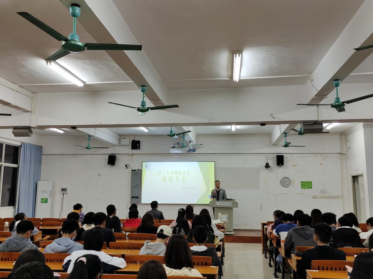 时值金秋,天高气爽,我们迎来了学校第二十九届校运会,本届校运会主题为“庆百年华诞创辉煌,激扬青春同心同行”。为充分调动运动员的积极性,以饱满的热情、昂扬的斗志参加学校第二十九届运动会,11月10日晚7点30分计算科学学院在杨楼510召开了动员会议。学院党委书记刘伟坚、党委副书记郭肖明,辅导员张素雅、廖蕃、吕依驰、解廷鑫出席会议,学院团委、学生会、青协副部长及以上学干、全体参赛运动员、全体陪护志愿者参加会议。本次会议由解廷鑫主持。