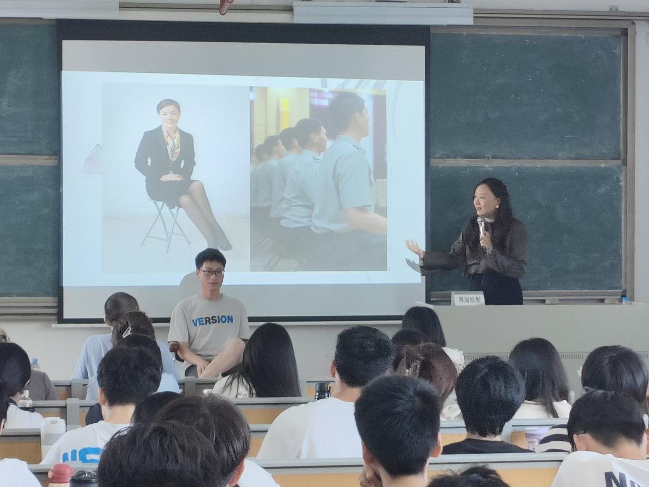 在穿着礼仪模块中,介绍了常见的职业穿搭技巧、妆容样式等。在个人形象模块中,周冠怡彤阐述了如何搭建个人可持续发展的外在形象和内在形象的规划方案。在交际礼仪模块,通过更加具体、生动的现场演示,展示了口语礼仪与肢体语言方面的知识,使学生能更加熟练灵活地运用社交规范与技巧,提高人际交往能力。