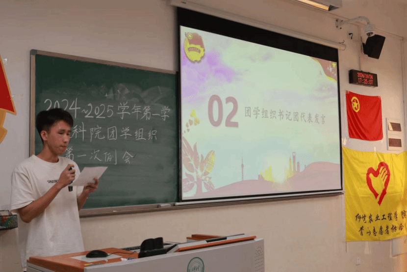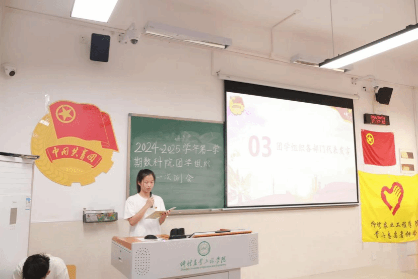 团学组织负责人陈国慧上台发言,介绍三大组织(团委、学生会、青协)合并的原因以及目的,对本月工作进行总结汇报,分析实际工作中存在的问题,并提出针对性的解决方案和近期的工作安排。